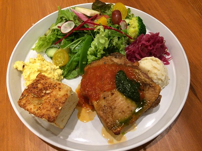 この日のお肉料理は、鶏もも肉のローストにトマトとバジルのソースがかかっていました。