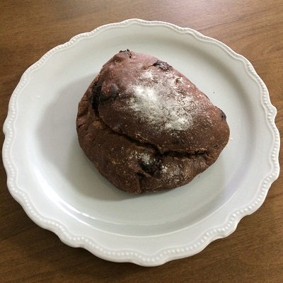 カカオパウダーが練り込まれたバゲット生地に、チョコのかけらが入ったセミハードのパン。