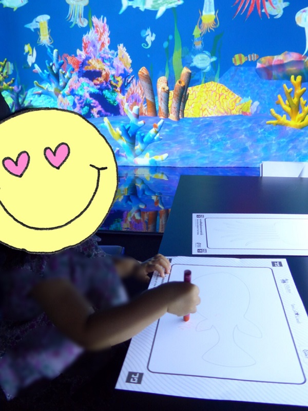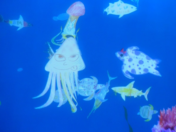 自分の描いた魚たちが大画面の水族館で泳ぎ始めるのです😍