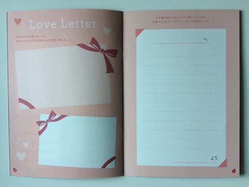 こちらは「ラブレター」となっており、写真を貼ったり、生まれた時の手形や足形をとって残せるというページ💫